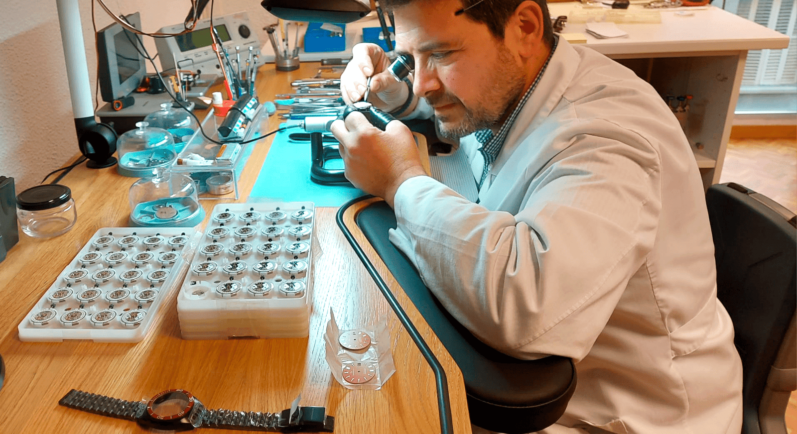 Miguel A. Martínez es técnico especialista en Micromecánica y Relojería. A lo largo de su carrera, pasó de instruirse sobre la relojería artesanal como aprendiz a ser becado como primer relojero de España de la promoción del 1996, lo que le permitió cursar estudios de especialización —y sus posteriores prácticas— en Suiza, en marcas de la talla de Omega, Rado o Tissot. Hace 8 años montó su propio taller de relojería en Palma de Mallorca con la ilusión de crear un espacio donde aplicar todos los conocimientos y la experiencia laboral obtenidos. Además, cabe destacar un par de hitos más en su trayectoria: fue seleccionado para un proyecto en colaboración con la Escuela de Relojería de Milán, y ha llegado a ser jefe de taller de marcas como Omega.